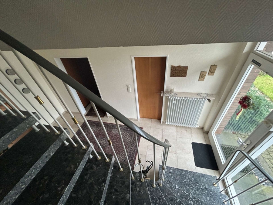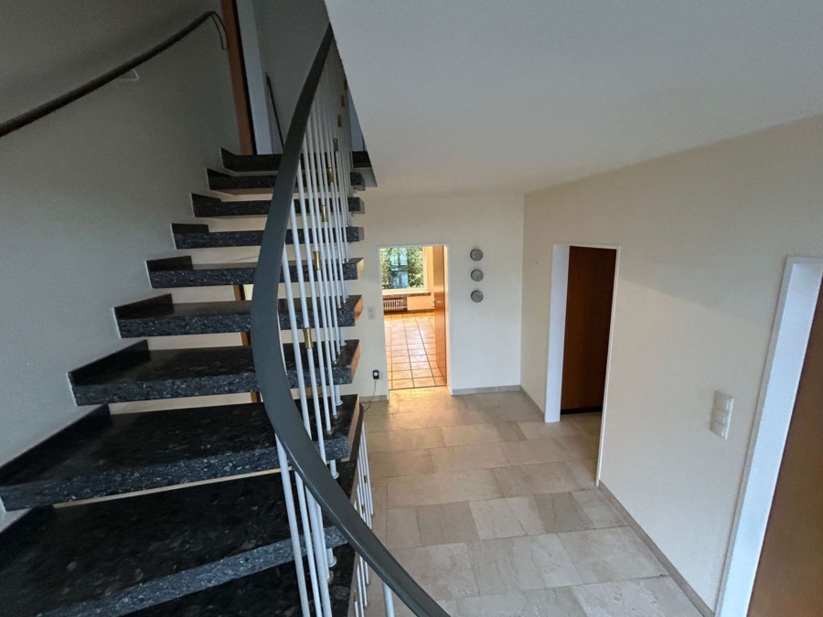 Hochwertige Fliesen im Treppenhaus und Wohnzimmer.
